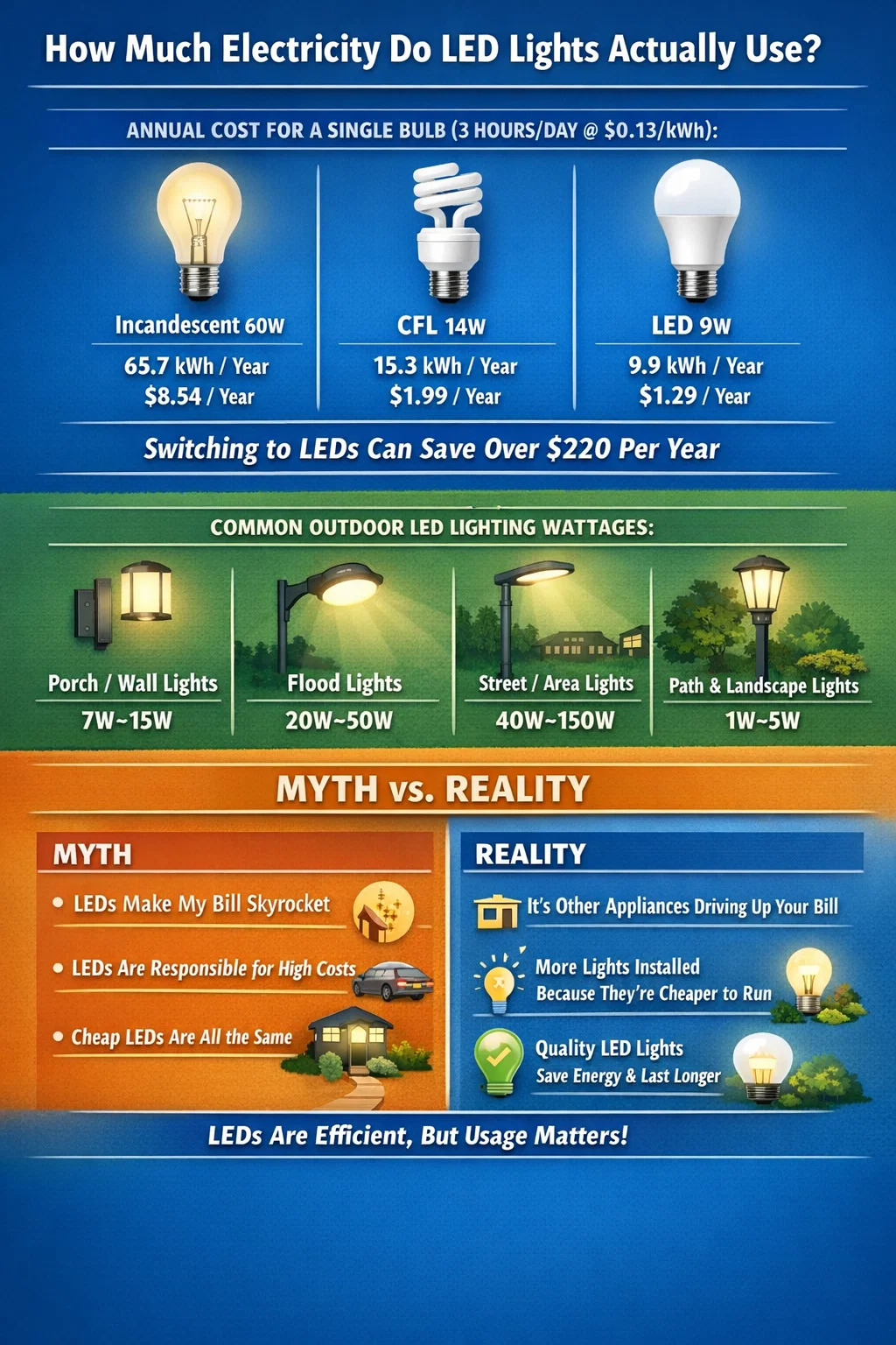 L’éclairage – même avant l’utilisation des LED – ne représente qu’une petite fraction de la consommation totale d’énergie d’une maison. Avec les LED, cette fraction diminue encore. Si votre facture est élevée, la réponse est presque certainement votre système CVC, votre chauffe-eau ou votre sécheuse électrique, et non votre éclairage extérieur LED.