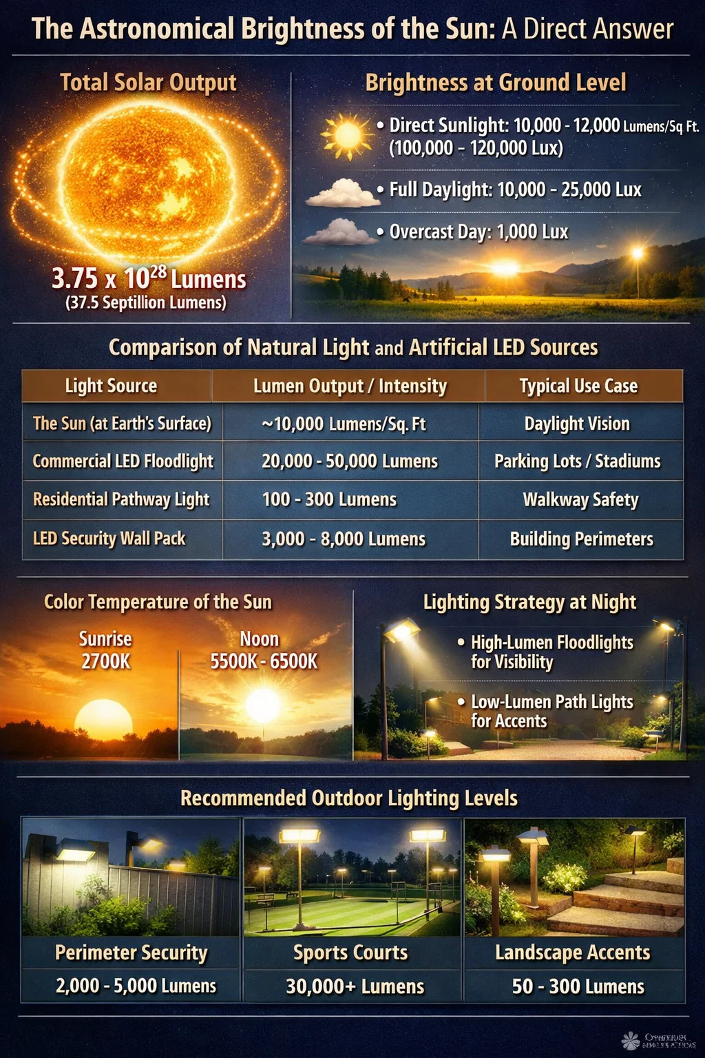 Comprendre ces chiffres est essentiel lors de la planification Éclairage LED extérieur installations. Bien que nous ne puissions pas reproduire l'intensité du soleil, ces références aident les ingénieurs à déterminer la quantité de lumière artificielle nécessaire pour assurer la visibilité, la sécurité et l'esthétique dans les environnements nocturnes.
