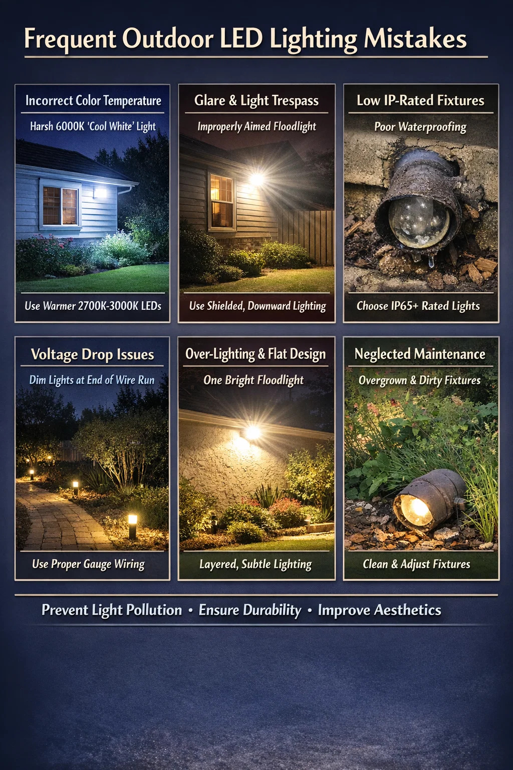 Le plus critique éclairage LED extérieur les erreurs impliquent un éblouissement excessif causé par un mauvais réglage des luminaires, une sélection d'une mauvaise température de couleur (CCT) et une négligence des principes du « ciel sombre » qui empêchent la pollution lumineuse. De plus, de nombreux propriétaires ne tiennent pas compte des chutes de tension dans les systèmes basse tension ou achètent des luminaires avec un indice de protection (IP) inadéquat, ce qui entraîne une panne matérielle prématurée. Résoudre ces problèmes nécessite un équilibre entre le flux lumineux fonctionnel et un placement attentif pour garantir la sécurité sans compromettre le confort visuel.